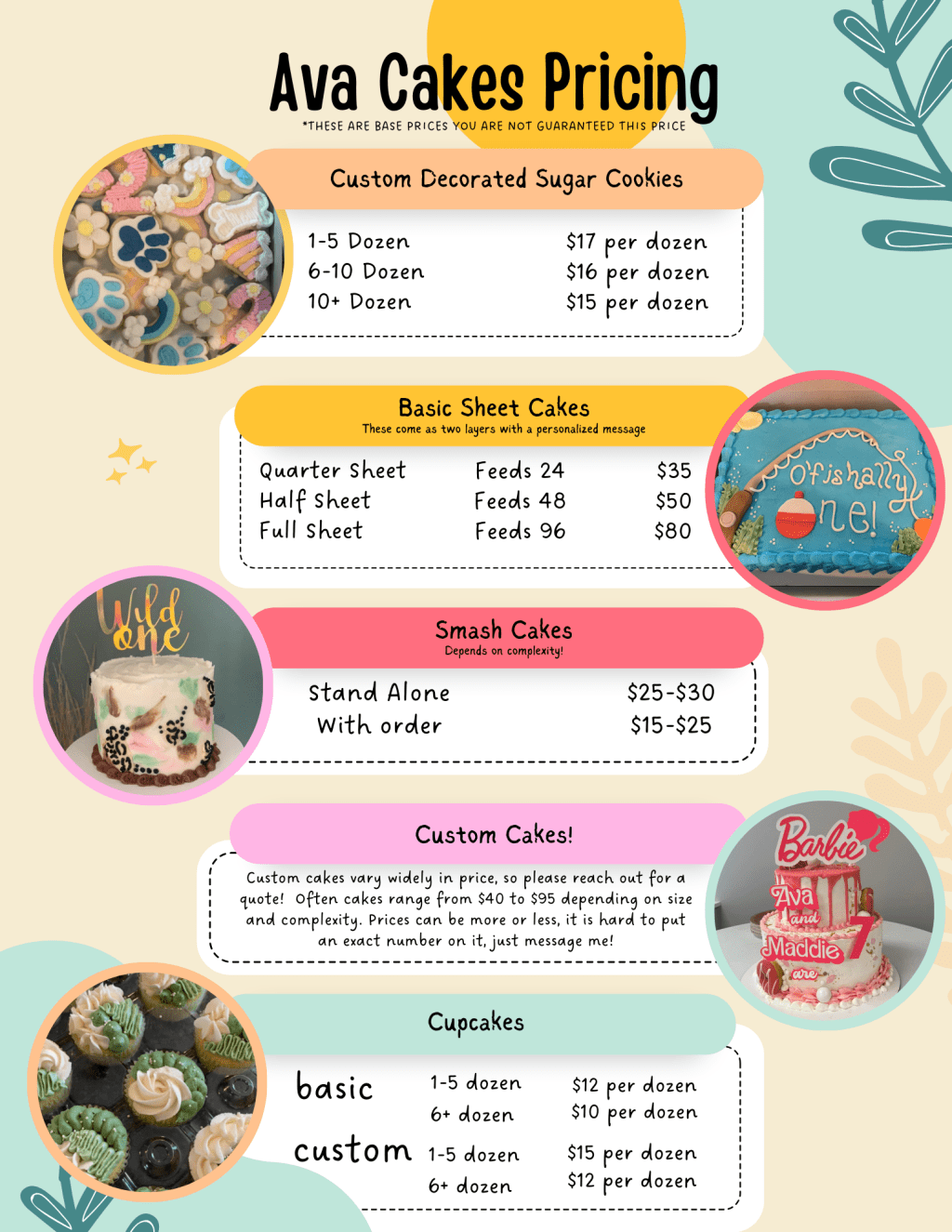 Above you can see some baseline prices, along with options! I also offer multiple other treats that aren’t listed on the pricing sheet, but feel free to just ask! For cake flavors we offer chocolate, white, red velvet, spice, lemon, strawberry, and pretty much any flavor you’d like! For fillings we do chocolate, vanilla, strawberry, cream cheese, lemon, raspberry, or whatever you please. We are always excited to try new flavors!